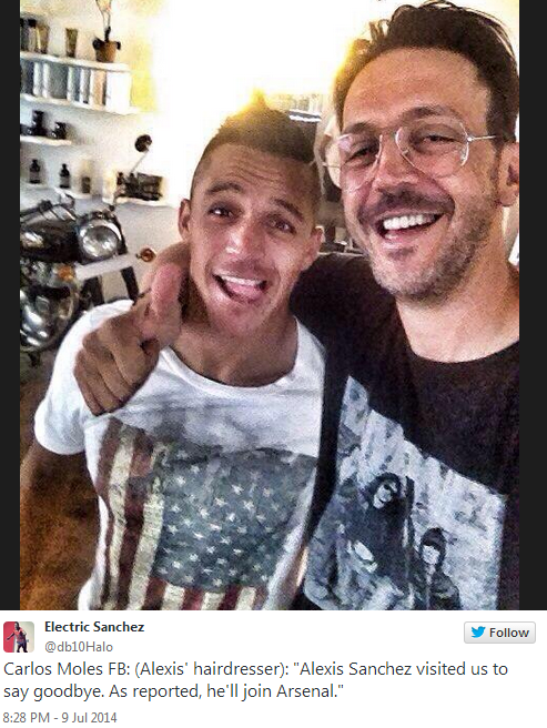 Η δεύτερη επιβεβαίωση για την μεταγραφή του Λατινοαμερικάνου στο Λονδίνο για χάρη της Άρσεναλ ήρθε από τον… κομμωτή του, ο οποίος ανέβασε την παρακάτω φωτογραφία γράφοντας: “Ο Αλέξις Σάντσες ήρθε για να μας αποχαιρετήσει, καθώς θα συνεχίσει στην Άρσεναλ”.