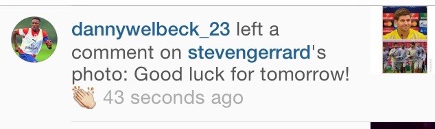 Πολύ καλές σχέσεις διατηρούν Ντάνι Γουέλμπεκ και Στίβεν Τζέραρντ, αν και αγωνίζονται σε διαφορετικές ομάδες, όπως φάνηκε και από το μήνυμα που ο πρώτος στον δεύτερο μέσω instagram.