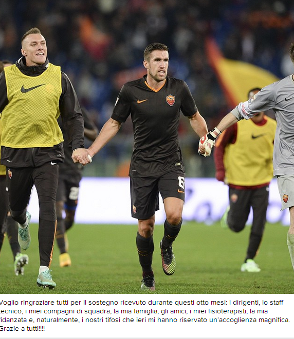 “Θέλω να ευχαριστήσω όλους όσους ήταν δίπλα τους τελευταίους οκτώ μήνες που ήταν πολύ δύσκολοι για εμένα. Το τεχνικό της ομάδας, το επιτελείο, τους συμπαίκτες μου, την οικογένειά μου, τους φίλους μου και φυσικά τους οπαδούς της Ρόμα που στο παιχνίδι με τη Τορίνο με υποδέχτηκαν θερμά. Σας ευχαριστώ όλους”, τα λόγια του.