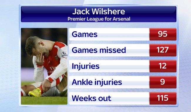 Αυτή ήταν και η τέλεια… πάσα προς τα αγγλικά ΜΜΕ για να ανατρέξουν στους στατιστικολόγους τους και να δουν πως ο Γουίλσιρ μπορεί να έχει αγωνιστεί σε 95 ματς με τους “κανονιέρηδες”, αλλά τα παιχνίδια που έχει χάσει είναι πολύ περισσότερα (112).