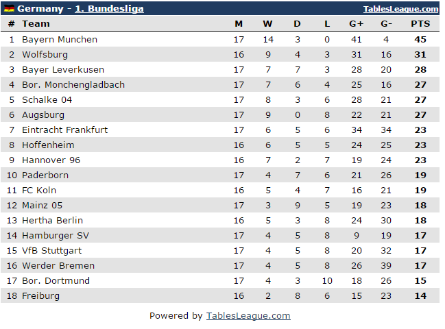 Εκτός από τη Ντόρτμουντ, ούτε οι υπόλοιπες λεγόμενες μεγάλες του γερμανικού ποδοσφαίρου κατάφεραν να πάρουν τρίποντο σήμερα. Η Μπάγερ Λεβερκούζεν ήταν πίσω στο σκορ από την Άιντραχτ Φρανκφούρτης για 50 ολόκληρα λεπτά(36′ Μάιερ), ισοφαρίζοντας τελικά με τον Μπελαραμπί. Από την άλλη η Σάλκε δεν κατάφερε να βρει δίχτυα κόντρα στο Αμβούργο, με το 0-0 να μένει μέχρι τέλους, ενώ η Γκλάντμπαχ αν και προηγήθηκε μόλις στο τρίτο λεπτό με τον Κρούζε να ευστοχεί από την άσπρη βούλα, η γηπεδούχος Άουγκσμπουργκ ανέτρεψε το σκορ με δύο γκολ των Φόλνερ και Μπομπαντίγια.