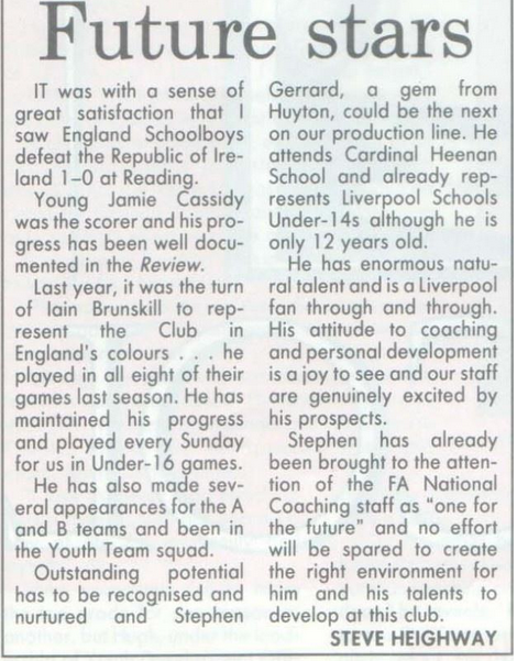 Μάλιστα, το 1992 ο 12χρονος τότε Στίβεν είδε σπουδαία λόγια από έναν παλαίμαχο παίκτη της Λίβερπουλ. Τον Στιβ Χάιγουεϊ, ο οποίος με τον σύλλογο του Μερσεϊσάιντ είχε κατακτήσει τέσσερα πρωταθλήματα την δεκαετία του 70, ενώ από το 1989 ως το 2007 είχε πόστο στις ακαδημίες της ομάδας.