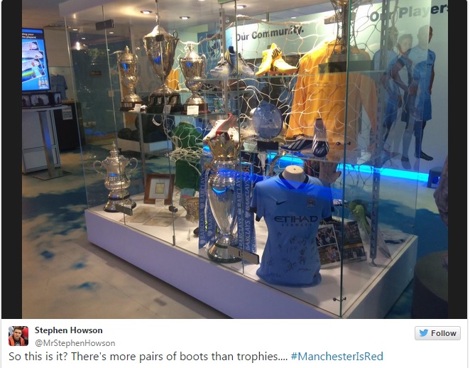 Εν συνεχεία κι αφού είχε δεκάδες φίλους της Σίτι να τον βρίζουν στο twitter ανέβασε φωτογραφία από τη τροπαιοθήκη της ομάδας γράφοντας πως είδε περισσότερα παπούτσια από ότι τρόπαια. Ευτυχώς για τους “σίτιζενς”, οι σεκιούριτι του μουσείου τον απομάκρυναν προς στιγμήν, ζητώντας του να συμπεριφερθεί πιο κόσμια και να μην προκαλεί άλλο, με τον ίδιο να δηλώνει πως η μπαταρία του κινητού του τελείωσε μη μπορώντας να βγάλει άλλες φωτογραφίες.