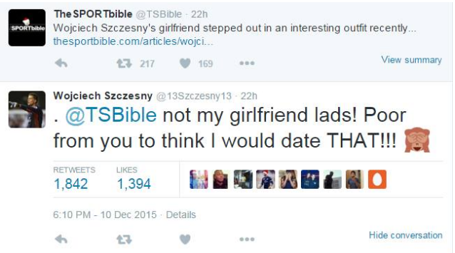 Συγκεκριμένα, ο Πολωνός τερματοφύλακας είδε να του «χρεώνουν» ότι διατηρεί σχέση με την κοπέλα της φωτογραφίας, η οποία δείχνει να έχει ένα …ιδιαίτερο γούστο στο ντύσιμο.