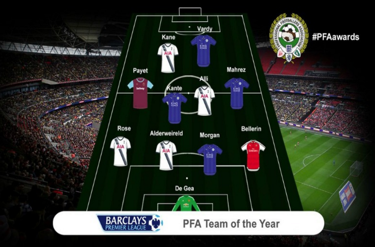 Αναλυτικά, τερματοφύλακας της σεζόν αναδείχθηκε ο Νταβίντ Ντε Χέα (Μάντσεστερ Γιουνάιτεντ), δεξιό μπακ ο Έκτορ Μπελερίν (Άρσεναλ), αριστερό μπακ ο Ντάνι Ρόουζ (Τότεναμ), σέντερ μπακ οι Τόμπι Αλντερβάιρελντ (Τότεναμ) και Γουές Μόργκαν (Λέστερ), στο κέντρο ξεχώρισαν όπως ήταν φυσικό οι Ενγκολό Καντέ (Λέστερ) και Ντέλε Άλι (Τότεναμ), δεξί χαφ ο Ριγιάντ Μαχρέζ (Λέστερ), αριστερό χαφ ο Ντιμιτρί Παγιέ (Γουέστ Χαμ) ενώ στην επίθεση τις θέσεις κατέλαβαν οι Χάρι Κέιν (Τότεναμ) και Τζέιμι Βάρντι (Λέστερ).