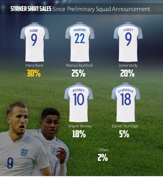 Οι φίλοι των “λιονταριών ανυπομονούν να βρεθούν στα γήπεδα της Γαλλίας για να υποστηρίξουν με τη φωνή τους το αντιπροσωπευτικό τους συγκρότημα. Εντύπωση κάνουν, πάντως, οι πωλήσεις των εμφανίσεων των παικτών του συνόλου του Ρόι Χόντσον με του Ράσφορντ με 15% να βρίσκονται κάτω μόνο από του Κέιν και του Γουίλσιρ.