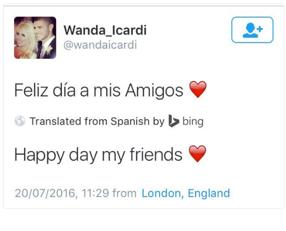 Μάλιστα, τις τελευταίες μέρες τα ιταλικά ΜΜΕ αναφέρουν πως ο φορ των “νερατζούρι” βρίσκεται στο Λονδίνο για να οριστικοποιήσει τη μεταγραφή του. Αυτό λίγο- πολύ επιβεβαίωσε και μέσω του προσωπικού της λογαριασμό στο twitter και η Γουάντα που έγραψε από την αγγλική πρωτεύουσα το παρακάτω μήνυμα:
