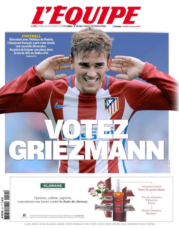 Εκτός αυτού η γαλλική εφημερίδα στο πρωτοσέλιδό της κάνει λόγο πως η “Χρυσή Μπάλα” φέτος θα πρέπει να πάει στον Γκριεζμάν που έκανε μία σούπερ χρονιά τόσο με την Ατλέτικο όσο και με την εθνική ομάδα της Γαλλίας με το φαβορί και φέτος για την κατάκτηση του τροπαίου να είναι ο Κριστιάνο Ρονάλντο που σήκωσε και Τσάμπιονς Λιγκ και Euro. votez