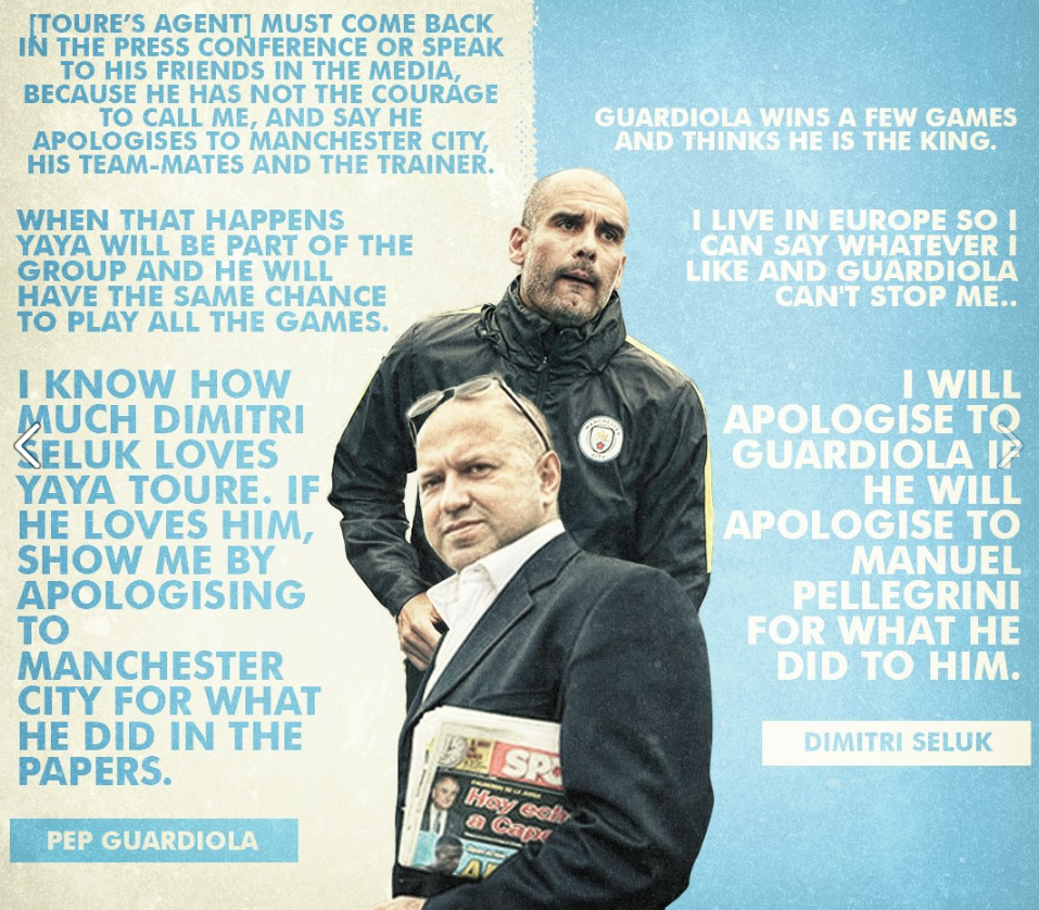 “Ήταν πολύ δύσκολο για μένα να τον αφήσω εκτός Champions League, πολύ δύσκολο. Τον γνωρίζω και ξέρω ότι είναι καλός τύπος. Την επόμενη μέρα ο μάνατζερ μίλησε όπως μίλησε και από εκείνη τη στιγμή ο Τουρέ είναι εκτός. Εκτός κι αν ο κύριος Σέλουκ επιστρέψει στη συνέντευξη Τύπου ή στους φίλους του τους δημοσιογράφους, αφού δεν έχει το θάρρος να απευθυνθεί απ’ ευθείας σε μένα και ζητήσει συγγνώμη πρώτα απ’ όλα από τη Μάντσεστερ Σίτι, μετά στους συμπαίκτες του και μετά στον προπονητή. Δεν αποδέχομαι ως προπονητής κάθε ατζέντη ποδοσφαιριστή που δεν παίζει, να πηγαίνει στους δημοσιογράφους και να μιλάει. Ξέρω πόσο πολύ ο Σέλουκ αγαπά τον Γιάγια Τουρέ. Αν λοιπόν τον αγαπά, πρέπει να ζητήσει συγγνώμη για αυτά που είπε στις εφημερίδες. Στη δική μου εποχή δεν φαντάζομαι τον ατζέντη κάποιου ποδοσφαιριστή να μιλά εναντίον του Γιόχαν Κρόιφ. Σήμερα οι ατζέντηδες πιστεύουν ότι είναι κάτι παραπάνω από αυτό που πραγματικά είναι. Αν έχεις ένα πρόβλημα, μπορούμε να το λύσουμε. Μέχρι να μιλήσει, ο Γιάγια δεν πρόκειται να παίξει”.