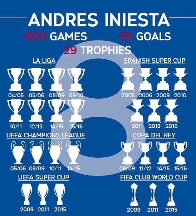 Άλλωστε όταν ο Μέσι λέει ότι σε θαυμάζει, τότε αυτό “μιλάει” από μόνο του. Όπως και η τροπαιοθήκη του Ινιέστα που θα ζήλευαν πολλοί παίκτες στον κόσμο. Ο Ισπανός στο εκτός έδρας παιχνίδι της Μπαρτσελόνα με τη Θέλτα συμπλήρωσε τις 600 εμφανίσεις με την ομάδα της καρδιάς του έχοντας πανηγυρίσει 55 γκολ, 29 τίτλους και αμέτρητες ασίστ και μαγικές ενέργειες.