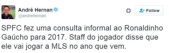 Ωστόσο, σύμφωνα με τον δημοσιογράφο Αντρέ Ερναν, ο Βραζιλιάνος σούπερ σταρ βρίσκεται πολύ κοντά στο να υπογράψει στην τελευταία ομάδα της καριέρας του: “Η Σάο Πάολο προέβη σε μία ανεπίσημη συζήτηση με τον Ροναλντίνιο Γκαούτσο για το 2017. Το επιτελείο του ποδοσφαιριστή είπε ότι θα αγωνιστεί στο ΜLS την επόμενη χρονιά”.