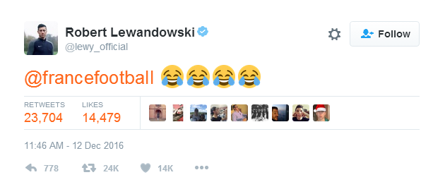 Αυτό δεν άρεσε και πολύ στον “Λέβα” που τα έβαλε με το “France Football” μέσω του προσωπικού του λογαριασμού στο twitter, όπου και πόσταρε τη θέση του με τρεις φάτσες να… κλαίνε από τα γέλια.