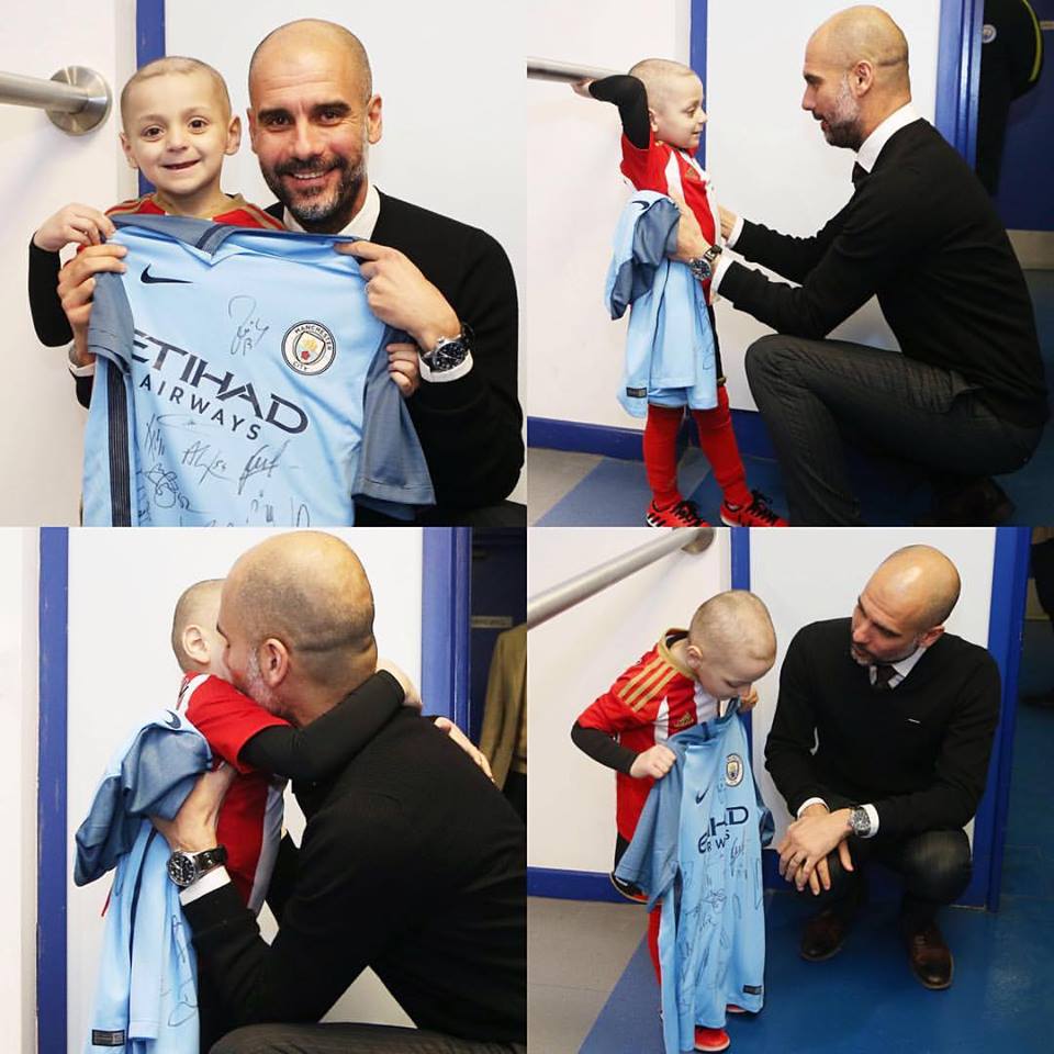 Ωστόσο, ο πρώην κόουτς της Μπαρτσελόνα και της Μπάγερν Μονάχου πήρε μία φανέλα της Σίτι, έβαλε όλους τους παίκτες του να υπογράψουν πάνω της και αργότερα την παρέδωσε στον μικρό φίλο της Σάντερλαντ που δίνει τη δική του μάχη για να παραμείνει στη ζωή και που έχει συγκλονίσει όλο το Νησί και όχι μόνο.