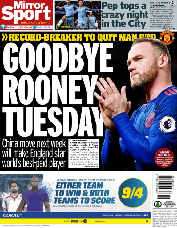 Οι φήμες περί αποχώρησης του Γουέιν Ρούνεϊ από τη Μάντσεστερ Γιουνάιτεντ έχουν οργιάσει τις τελευταίες μέρες. Ειδικότερα, σε πρόσφατο πρωτοσέλιδο της Mirror παρουσιάστηκε ως σίγουρο ότι ο Άγγλος επιθετικός μέχρι την Τρίτη (28/2), την ημέρα δηλαδή που λήγει η διορία των μεταγραφών στην Κίνα, θα αποτελέσει παρελθόν από τη Γιουνάιτεντ καθώς θα μετακομίσει στην ασιατική ήπειρο. Γράφτηκε, μάλιστα, ότι θα γίνει ο πιο ακριβοπληρωμένος ποδοσφαιριστής στον κόσμο με εβδομαδιαίες απολαβές που θα φτάνουν τις 900 χιλιάδες ευρώ.