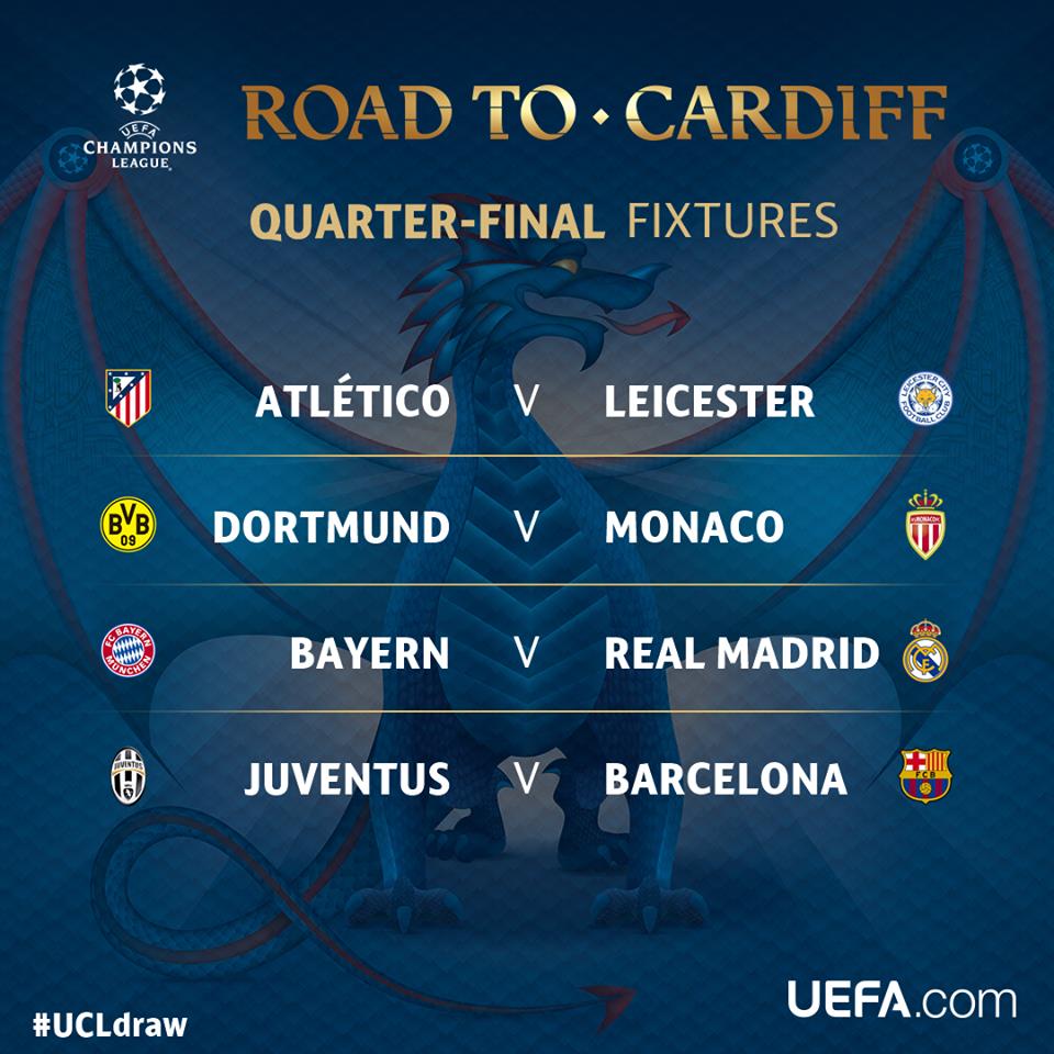 Το πρώτο ζευγάρι που βγήκε ήταν αυτό της Ατλέτικο Μαδρίτης με τη Λέστερ και στη συνέχεια ακολούθησαν Μπορούσια Ντόρτμουντ – Μονακό, Μπάγερν Μονάχου – Ρεάλ Μαδρίτης και Γιουβέντους – Μπαρτσελόνα.