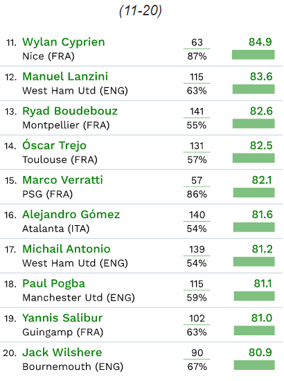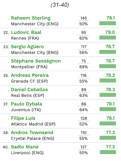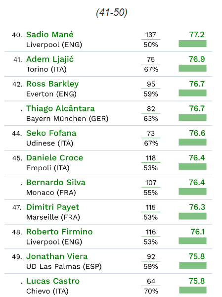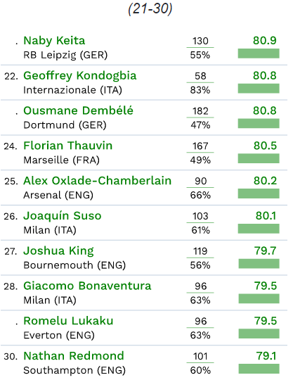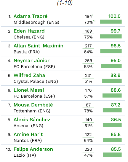 Ειδικότερα, ο αντιεμπορικός ακραίος επιθετικός της Μίντλεσμπρο, Αντάμα Τραορέ, βρίσκεται στην κορυφή της σχετικής λίστας αφήνοντας τον Αζάρ στη δεύτερη θέση, τον Νεϊμάρ στην τέταρτη και τον Μέσι στην έκτη. Να σημειωθεί ότι το σκορ υπολογίζεται διαιρώντας τις προσπάθειες για ντριμπλα προς το ποσοστό των επιτυχημένων προσπαθειών.