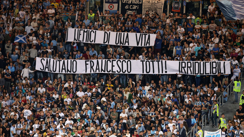 Στο 29ο λεπτό του ματς, σήκωσαν ένα πανό που έγραφε “I nemici di una vita salutano Francesco Totti” και στα Ελληνικά σημαίνει “Οι εχθροί μιας ζωής χαιρετούν τον Φραντσέσκο Τότι”.