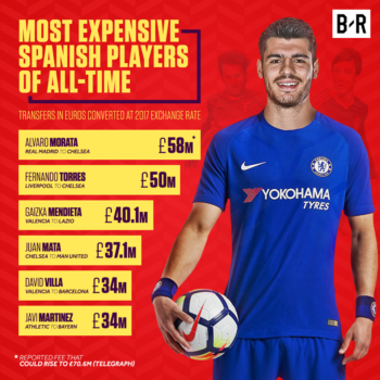Η επικείμενη μεταγραφή του Αλβάρο Μοράτα από την Ρεάλ Μαδρίτης στην Τσέλσι αναμένεται να ξεπεράσει τα 58 εκ. λίρες. Μάλιστα η «Telegraph» αναφέρει πως το ποσό θα αγγίξει τα 70,6 εκ. λίρες, γεγονός που θα κάνει τον Μοράτα την πιο ακριβή μεταγραφή Ισπανού ποδοσφαιριστή στην ιστορία.