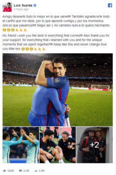 «Φίλε μου, εύχομαι να σου έρθουν τα καλύτερα. Σε ευχαριστώ για τη στήριξη και για όλα όσα έμαθα από εσένα. Περάσαμε μαζί μοναδικές στιγμές. Μείνε όπως είσαι και συνέχισε, μην αλλάξεις, σε αγαπώ μικρέ αδερφέ μου», ήταν το μήνυμα του Ουρουγουανού σταρ.