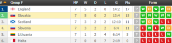 Στα άλλα παιχνίδια του έκτου ομίλου η Σλοβακία επικράτησε εντός έδρας της Σλοβενίας με 1-0 χάρη σε γκολ του Νέμεκ στο 81ο λεπτό ενώ η Σκωτία απέδρασε με το διπλό από Λιθουανία, φτάνοντας σε εύκολη νίκη με 3-0.