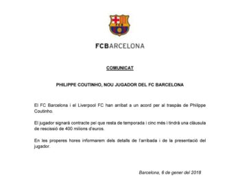 Παίκτης της Μπαρτσελόνα με κάθε επισημότητα είναι ο Φελίπε Κουτίνιο. Η μεταγραφή κόστισε στους Καταλανούς 160 εκ. ευρώ, ενώ η ρήτρα αποδέσμευσης είναι στα 400 εκ. ευρώ. Το κόστος του ντιλ λοιπόν για την ομάδα της Βαρκελώνης φτάνει τα 160.000.000 ευρώ (120.000.000+40.000.000 μπόνους), εξέλιξη που την καθιστά ως την δεύτερη πιο δαπανηρή μεταγραφή στην ιστορία του ποδοσφαίρου, ξεπερνώντας αυτές των Ντεμπελέ και Πογκμπά.