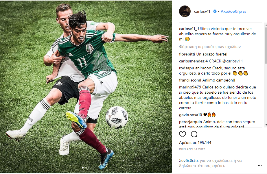 Συγκεκριμένα, ο επιθετικός των Μεξικανών έγραψε: «Τελευταία νίκη που είδες παππού, ελπίζω να είσαι περήφανος για μένα». Το αντίο, συνοδευόταν από μια φωτογραφία του από την σπουδαία νίκη των «Aztecas» επί των Γερμανών στην πρώτη αγωνιστική του Μουντιάλ.