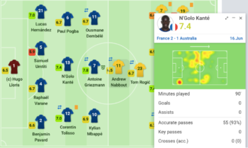 Ειδικότερα, μετά από δύο αναμετρήσεις μετράει 27 ανακτήσεις της μπάλας, εκ των οποίων οι 13 πραγματοποιήθηκαν κόντρα στο Περού και οι υπόλοιπες 14 κόντρα στην Αυστραλία. Κανείς άλλος Γάλλος δεν έχει πράξει κάτι αντίστοιχο στα προηγούμενα δύο Παγκόσμια Κύπελλα, με εξαίρεση τον Πολ Πογκμπά, το 2014.