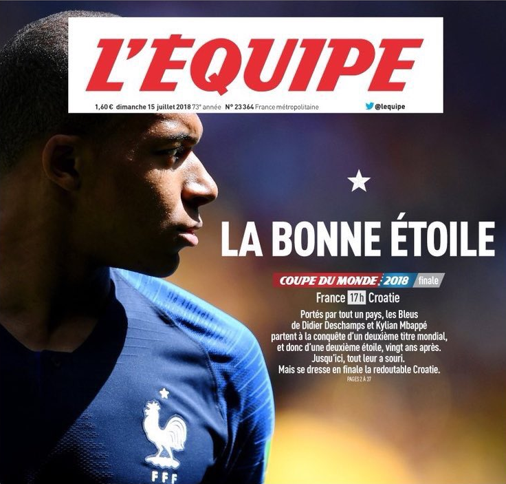 Με τίτλο «το καλό αστέρι» και φωτογραφία του Κιλιάν Μπαπέ κυκλοφόρησε η Γαλλική εφημερίδα «Equipe» ανήμερα του τελικού του Παγκοσμίου Κυπέλλου, όπου οι Γάλλοι θα αντιμετωπίσουν τους Κροάτες.