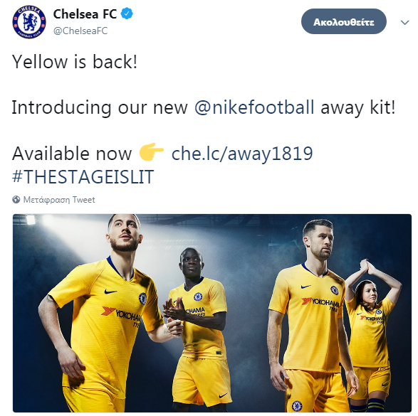 Στα κίτρινα θα ντύνεται η Τσέλσι όταν αγωνίζεται μακριά από το γήπεδό της, με τους Λονδρέζους να επιστρέφουν στο αγαπημένο τους κίτρινο, που φορέθηκε πολύ τη δεκαετία του 60 ενώ εμφανίστηκε και στις δεκαετίες 80 και 90.