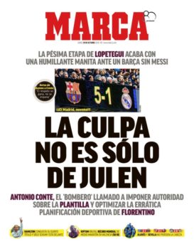 Στο πρωτοσέλιδό της, η Marca, έχει τοποθετήσει μονάχα τη φωτογραφία του φωτεινού πίνακα του Καμπ Νόου με το τελικό σκορ στο παιχνίδι της Κυριακής, τονίζει πως «δεν ευθύνεται μόνο ο Λοπετέγκι» και αναφέρει χαρακτηριστικά ότι «ο Κόντε έρχεται ως… πυροσβέστης να διορθώσει τον ανεπαρκή σχεδιασμό που έκανε ο Φλορεντίνο»!