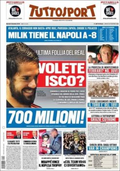 Από την άλλη ο Ιταλικός τύπος αναφέρει αυτούσια την είδηση πως ο Ίσκο θα γίνει διαθέσιμος για πώληση μόνο και εφόσον καλυφθεί η ρήτρα του η οποία είναι ούτε λίγο ούτε πολύ 700εκ. ευρώ.