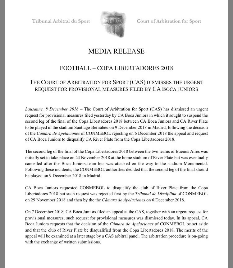 Δεν αλλάζει κάτι στη διεξαγωγή του δεύτερου τελικού του Κόπα Λιμπερταδόρες στη Μαδρίτη! Το CAS έριξε «άκυρο» στην έφεση της Μπόκα Τζούνιορς, που ζητούσε τον αποκλεισμό της Ρίβερ Πλέιτ. Έτσι, το παιχνίδι θα γίνει κανονικά το βράδυ της Κυριακής (9/12) στο «Σαντιάγκο Μπερναμπέου».