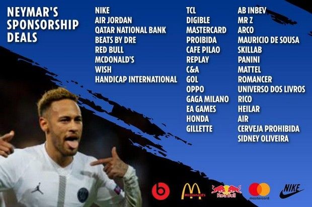 Σύμφωνα με το γνωστό περιοδικό Forbes, ο Νεϊμάρ εκτός του ετήσιου συμβολαίου του με τους Παριζιάνους, το οποίο του αποφέρει 60 εκατομμύρια ευρώ έχει να λαμβάνει πολλά περισσότερα. Το μπραντ που έχει χτίσει ο ίδιος έχει αποφέρει 35 εταιρίες (στην πλειοψηφία τους κολοσσούς) που εκτοξεύουν κι άλλο το νούμερο.