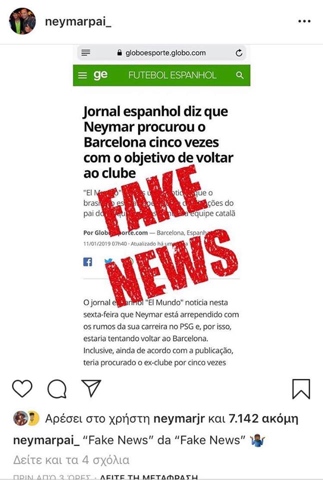 Λίγα μόλις εικοσιτετράωρα μετά τις φήμες που οργίαζαν για συνεχή τηλεφωνήματα του 26χρονου σταρ προς τον πρόεδρο της Μπαρτσελόνα, Ζοσέπ Μαρία Μπαρτομεόυ, αλλά και άλλα πρόσωπα εντός της ομάδας, ο “Neymar pai”, δημοσίευσε στον προσωπικό του λογαριασμό στο Instagram την παρακάτω φωτογραφία, χαρακτηρίζοντας ψευδή τα νέα που διαδίδονται από τα ισπανικά ΜΜΕ:
