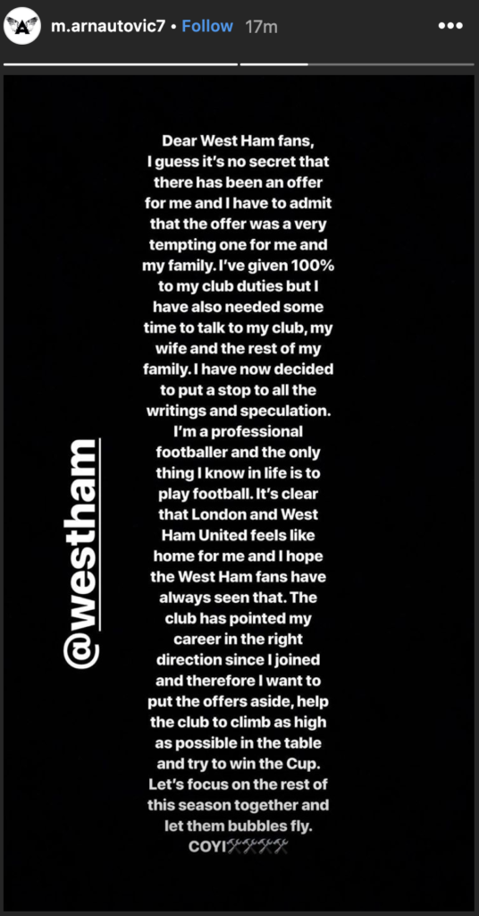Ο Μάρκο Αρναούτοβιτς δεν πρόκειται να αποχωρήσει -τουλάχιστον σύντομα- από τη Γουέστ Χαμ, όπως έκανε γνωστό με μήνυμά του.