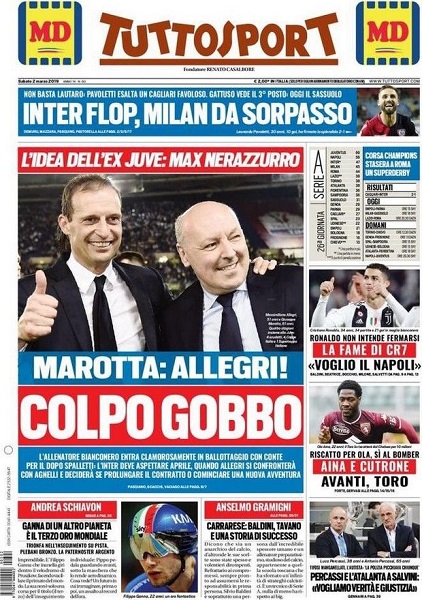 «Αλέγκρι και Κόντε είναι οι βασικοί υποψήφιοι του Μπέπε Μαρότα για τη θέση του Σπαλέτι. Η Ίντερ περιμένει το αποτέλεσμα της συνάντησης του Αλέγκρι με τον πρόεδρο Ανιέλι τον Απρίλιο, όπου θα γίνει σαφές αν θα επεκτείνει τη συνεργασία του με την Γιουβέντους ή θα συνεχίσει αλλού το ταξίδι του”, αναφέρει χαρακτηριστικά στο σημερινό πρωτοσέλιδό της.