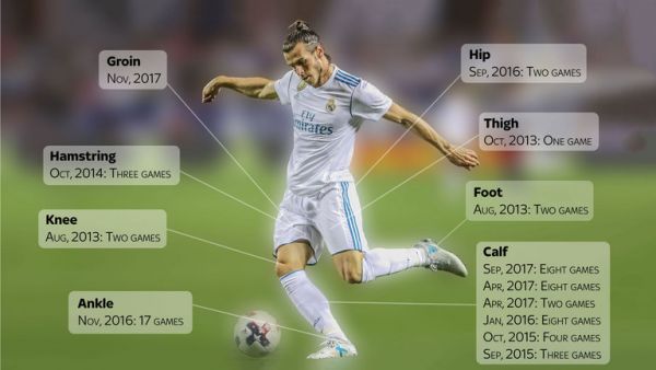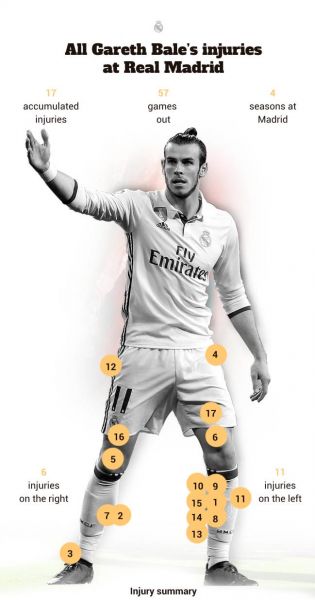 Τα πράγματα όμως για τον Μπέιλ δεν είχαν την ανάλογη συνέχεια. Από το καλοκαίρι του 2013, όταν αποκτήθηκε από την Τότεναμ για 100.000.000 ευρώ, έχει τραυματιστεί 22 φορές, με συνέπεια να χάσει 84 αγώνες, σχεδόν δύο σεζόν από τις 5,5 που ανήκει στους ‘μερένγκες’.