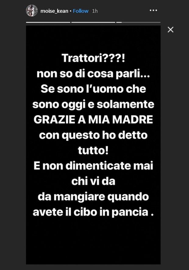 «Ο Μόιζε υποστήριζε την Ίντερ ως παιδί επειδή αγαπούσε τον Ομπαφέμι Μάρτινς . Έπαιζε στην Τορίνο αλλά τον έστειλα στην Γιουβέντους επειδή είμαι φαν των μπιανκονέρι. Έχω χωρίσει με τη μητέρα του Μόιζε και εκείνη στο παρελθόν ήθελε να πάει το παιδί στην Αγγλία. Υποσχέθηκα στην Γιουβέντους ότι θα τον κρατούσα στην Ιταλία αλλά ήθελε για αντάλλαγμα δύο τρακτέρ. Μου απάντησαν πως αυτό δεν ήταν πρόβλημα αλλά δεν τα έχω ακόμα λάβει, τώρα δεν μου δίνουν καν εισιτήρια για να πηγαίνω στα ματς και δεν απαντούν στις κλήσεις μου», δήλωσε ο Μπιόρου Κιν.