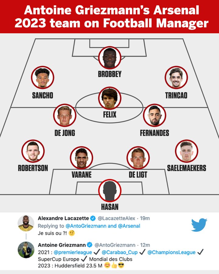Εκεί μπορεί ο καθένας να φτάσει μέχρι την κορυφή της Αγγλίας/ της Ευρώπης/ του κόσμου αν και εφόσον κάνει τις σωστές κινήσεις. Ο Γκριεζμάν βρίσκεται στο 2023 και έχει κάνει φτιάξει ένα σύνολο που είναι πολύ καλό, όπως φαίνεται και στην παρακάτω φωτογραφία. Ωστόσο, ο Αλεξάντρ Λακαζέτ του την “είπε”. Αν και φίλοι ο στράικερ της Μπαρτσελόνα δεν τον είχε στα πλάνα του με τον νυν επιθετικό της αγγλικής ομάδας να ζητάει τα… ρέστα.