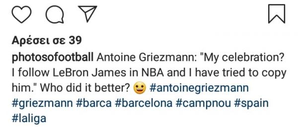 Ο Γκριεζμάν πανηγύρισε δεόντως το δεύτερο γκολ που σημείωσε στο παιχνίδι με την Μπέτις, με τις "κακές γλώσσες" να λένε ότι προσπάθησε να μιμηθεί τον Μέσι. Ο Γάλλος παραδέχτηκε ότι "αντέγραψε", δίνοντας όμως άλλη εκδοχή για το "κάτοχο" του πανηγυρισμού!