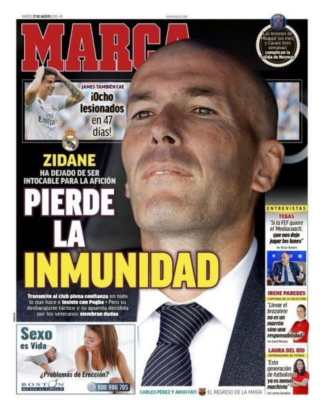 Λίγο καιρό μετά όμως και με βάση τα αποτελέσματα του Γάλλου τεχνικού στον πάγκο της Ρεάλ, αρχίζουν οι πρώτες αμφιβολίες. Πρώτη στο χορό μπήκε η «MARCA». Η Ισπανική εφημερίδα αναφέρει σήμερα στο πρωτοσέλιδό της πως ο Ζιζού έπαψε πλέον να έχει χάσει την ασυλία που είχε μέχρι πρότινος.