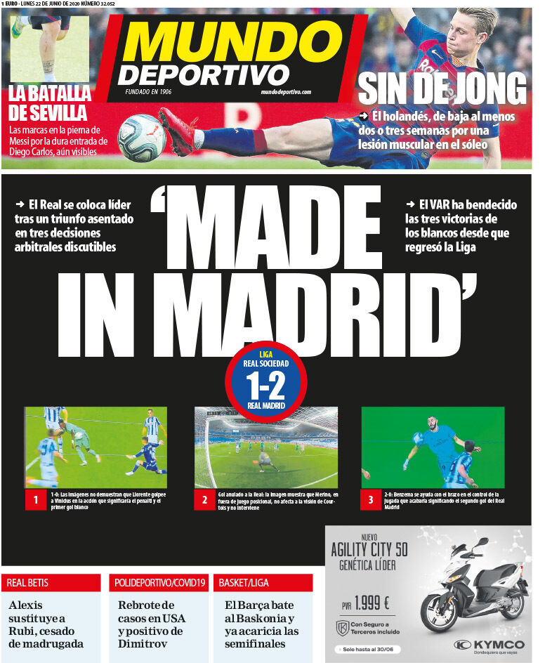 Το σκορ άνοιξε με πέναλτι ο Σέρχιο Ράμος. Ωστόσο, αυτή η απόφαση φαίνεται πως άρεσε σε πολλούς στο στρατόπεδο της Μπαρτσελόνα. Γι’ αυτό το λόγο και η “Mundo Deportivo” έκανε λόγο για “πέτσινο” πέναλτι και ότι το VAR σε ακόμη μία αναμέτρηση δεν ήταν ουδέτερο, όπως όφειλε. Αλλά ήταν με το μέρος των Μαδριλένων, οι οποίοι χωρίς αυτό θα έχαναν βαθμούς και θα ήταν στη δεύτερη θέση του πρωταθλήματος. Πίσω από την “Μπάρτσα”.