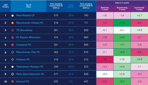 Στο παραπάνω γράφημα φαίνονται τα έσοδα των 10 κορυφαίων συλλόγων της Ευρώπης το 2014 και το 2019. Ενώ όλες οι ομάδες είδαν αύξηση άνω του 20%,η Άρσεναλ ανέβασε τα έσοδα της μόλις κατά 2%! Την ίδια στιγμή η Τότεναμ διπλασίασε τα έσοδα της. Ενδεικτικό της στάσιμης κατάστασης που είχε ξεκινήσει να μπαίνει ο σύλλογος, προτού φτάσει στο ναδίρ φέτος.