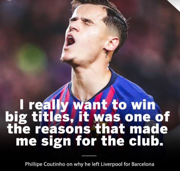 Η καζούρα, μάλιστα, που δέχεται ο 28χρονος ποδοσφαιριστής λόγω μίας δήλωσης που είχε κάνει στο παρελθόν δεν τον βοηθά να ξεχάσει εύκολα. Ειδικότερα, το Φεβρουάριο του 2018, λίγες μέρες αφού μετακόμισε στη Βαρκελώνη είχε δηλώσει ότι ήρθε στο σύλλογο για να κατακτήσει τίτλους.