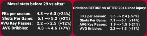 Κάποιοι ισχυρίζονται ότι γι΄αυτό ευθύνεται ο πανδαμάτωρ χρόνος. Ωστόσο, αυτό δεν ισχύει για έναν εξωγήινο παίκτη, όπως ο Ρονάλντο. Μία σύγκριση με τον μοναδικό παίκτη που μπορεί να συγκριθεί μαζί του, τον Λιονέλ Μέσι, αποδεικνύει ότι δεν είναι η ηλικία αλλά ο τραυματισμός του, η βασική αιτία της σταδιακής πτώσης των αριθμών του.