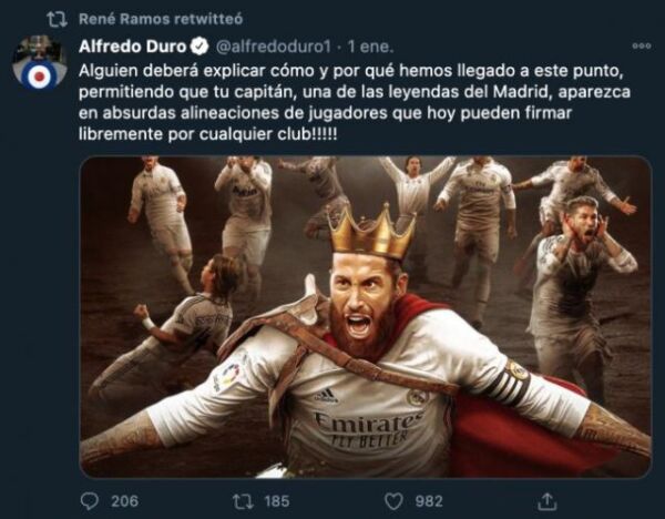 Ο αδερφός του Σέρχιο Ράμος έσπευσε να συμφωνήσει απόλυτα με τα λεγόμενα του Ισπανού δημοσιογράφου κάνοντας αναδημοσίευση την παρακάτω ανάρτηση. «Κάποιος θα πρέπει να κληθεί να εξηγήσει πως και γιατί έχουμε φθάσει ως εδώ. Επιτρέποντας στον αρχηγό και θρύλο της Ρεάλ Μαδρίτης να εμφανίζεται ως στόχος άλλων ομάδων που μπορούν από σήμερα να διαπραγματευτούν μαζί του όντας ελέυθερος» ανέφερε ο Αλφρέντο Ντούρο.