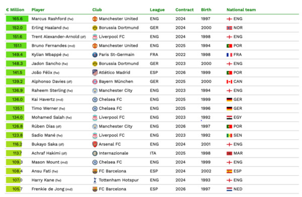 Ο Άγγλος επιθετικός της Μάντσεστερ Γιουνάιτεντ βρίσκεται στην κορυφή της λίστας, στοιχίζοντας 166 εκατ. ευρώ. Ένα δεύτερος σούπερ σταρ των “κόκκινων διαβόλων”, ο Μπρούνο Φερνάντεζ, βρίσκεται στην 4η θέση (151 εκατ. ευρώ. Ένας δεύτερος Άγγλος, ο Αλεξάντερ Άρνολντ, βρίσκεται στην 3η θέση (152 εκατ. ευρώ).