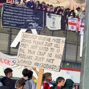 Αυτή ήταν και η σταγόνα που ξεχείλισε το ποτήρι για τους Λονδρέζους. Μάλιστα, αρκετοί από δαύτους κρατούσαν πλακάτ στα χέρια τους με υβριστικά συνθήματα προς το πρόσωπο του Κροένκε. Κάτι που δεν μας είχαν συνηθίσει. Χαρακτηριστικό, λοιπόν, για το κλίμα που επικρατεί εντός των “κανονιέρηδων” που δείχνουν ότι είναι είναι καζάνι που βράζει.
