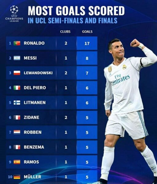 Τα στατιστικά πάντα λένε την αλήθεια. Ο Κριστιάνο Ρονάλντο είναι με διαφορά από τον δεύτερο ο πιο καθοριστικός παράγοντας σε κρίσιμες καταστάσεις στο Τσάμπιονς Λιγκ. Ο ποδοσφαιριστής με τα περισσότερα τέρματα σε ημιτελικά και τελικούς. Πιο συγκεκριμένα, ο 35χρονος έχει βρει δίχτυα 17 (!!!) φορές αφήνοντας πολύ πίσω τον δεύτερο Λιονέλ Μέσι με οκτώ τέρματα. Οι δυο τους κοντράρονται παραδοσιακά σε πολλές στατιστικές όμως εδώ ο νικητής της μονομαχίας είναι ξεκάθαρος.