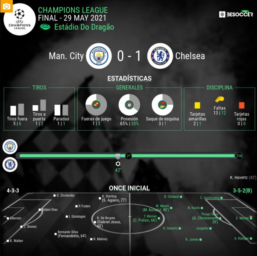 Σύμφωνα με τα στατιστικά του «BeSoccer», που παρουσιάζει η «AS», η Σίτι έκανε σε ολόκληρο το ματς ένα σουτ στο στόχο. Μάλιστα, στο δεύτερο ημίχρονο που κυνηγούσαν στο σκορ, οι «πολίτες» δεν απείλησαν καθόλου την εστία του Μεντί. Η ομάδα του Πεπ Γκουαρντιόλα είχε την μπάλα στα πόδια της στη μεγαλύτερη διάρκεια του ματς, αλλά την… παίδευε. Συνολικά είχε 65% κατοχή, μέσω της οποίας δεν μπορούσε να δημιουργήσει επικίνδυνες καταστάσεις. Από την άλλη το 35% της Τσέλσι, ήταν αρκετό για να αποτελεί μια διαρκή απειλή στην κόντρα.